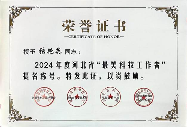 近日,公司张艳英教授在2024年度的河北省“最美科技工作者”提名及评选活动中荣获“最美科技工作者”提名称号。该荣誉由省科技厅、省科学技术协会、省科公司、省国防科技工业合作办公室联合颁发,旨在弘扬科学家精神,激发科技工作者责任感。